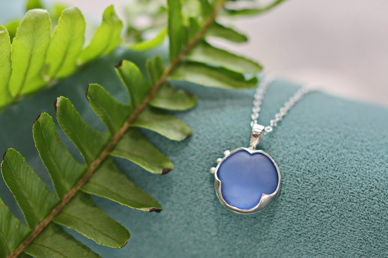 Χειροποίητο κολιέ από ασήμι 925 και γυαλάκι θάλασσας με ασημένια αλυσίδα. Διάμετρος κύκλου 2,7εκ