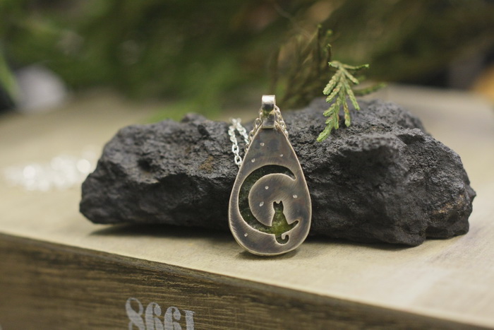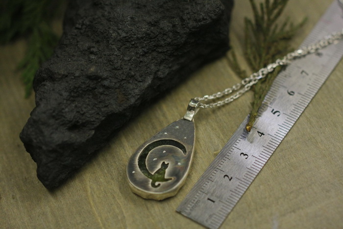 Χειροποίητο κολιέ από ασήμι 925 και Βασανίτη. Στην πίσω του μεριά υπάρχει γατάκι που κάθεται στο φεγγάρι, έτσι μπορείτε να το φορέσετε από όποια μεριά θέλετε.
