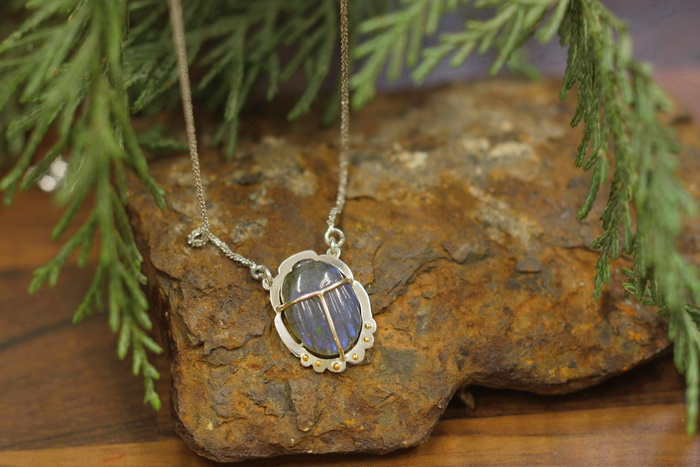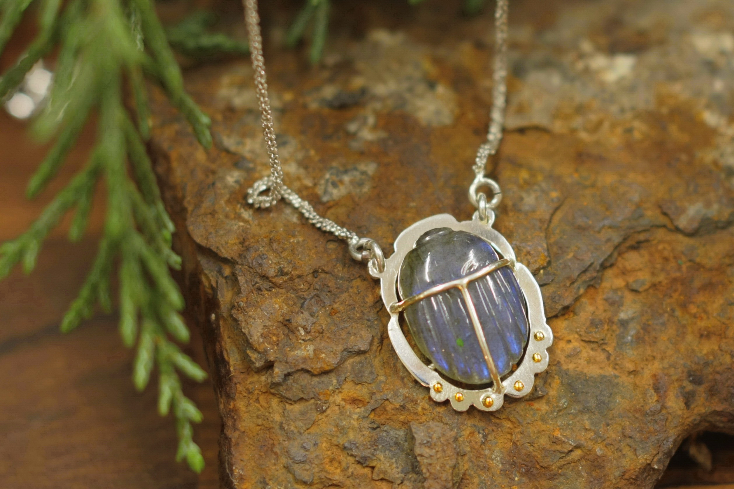 Χειροποίητο κολιέ από ασήμι 925 και χρυσό 9 καρατίων με λαξεμένη πέτρα λαβραδορίτη σε σχήμα σκαραβαίου.